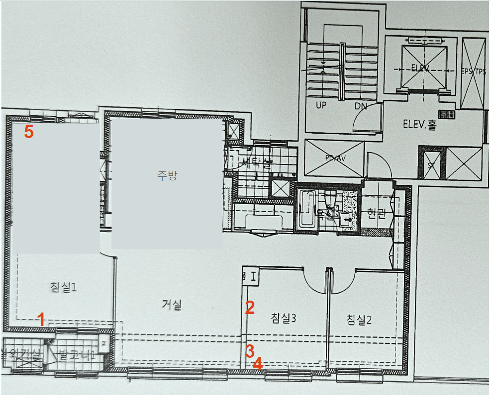 엘리베이터 소음은 그래도 접근은 할 수 있는데.. 침실1의 1번에서 소리가 나는 것은 벽이 아니라, 천장의 끝에서 나는 것이라서.. (진동의 끝단이라서 나는 소리입니다.) 천장 마감을 뜯고, 모서리를 중심으로 흡음재를 붙이면 소리가 감쇄될 가능성이 있긴 합니다.  다만 단열공사도 같이 해야 해서, 꽤 비용이 많이 들거여요.