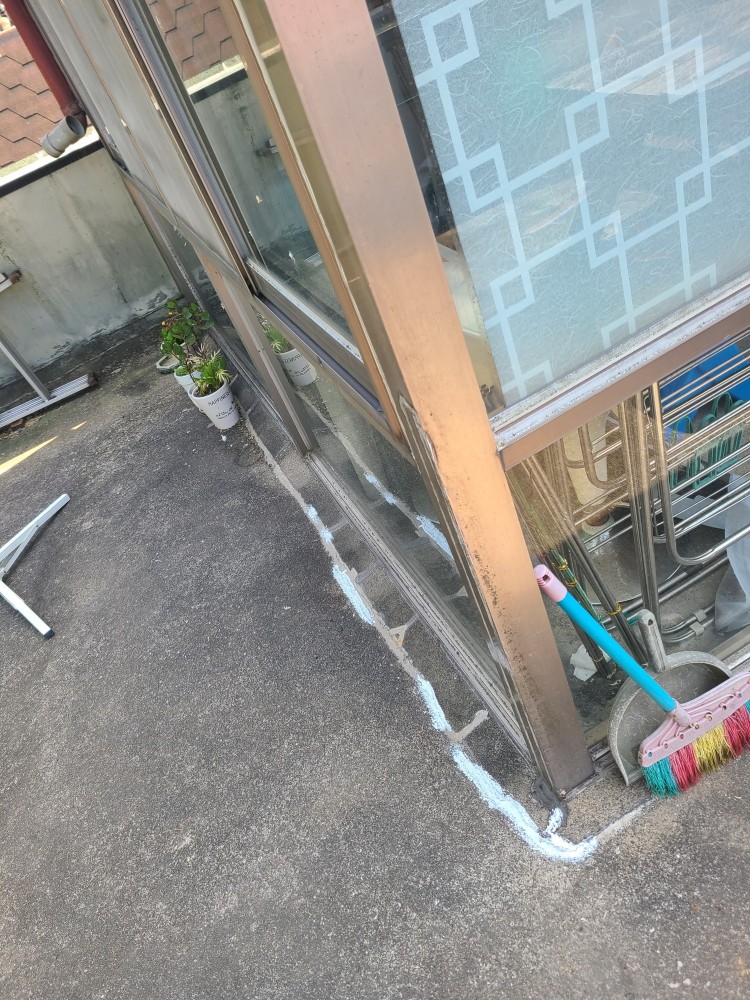 애초에 이렇게 설계가 되고 시공이 된 부분 자체가 하자입니다. 방수턱의 높이도 없고, 창틀과 바닥이 만나는 곳도 몰탈로 경사를 주고 끝내었기에, 방수 공사를 하더라고 언제든 누수가 생겨도 전혀 이상하지 않는 바탕을 가지고 있기에 그렇습니다.