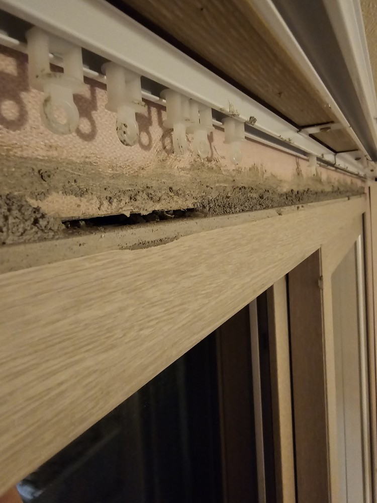 세 번째 사진은 벽지 위에 몰탈 마감하여 벽지가 뜯어지며 콘크리트가 떨어진 사진입니다.