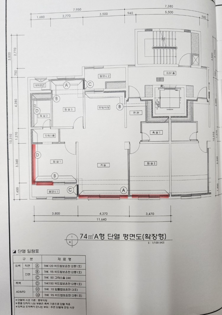 설계도를 보니 안방쪽은 150T 비드법보온판2종1호, 거실 확장부와 작은방 확장부는 같은 종류의 120T가 들어가 있습니다