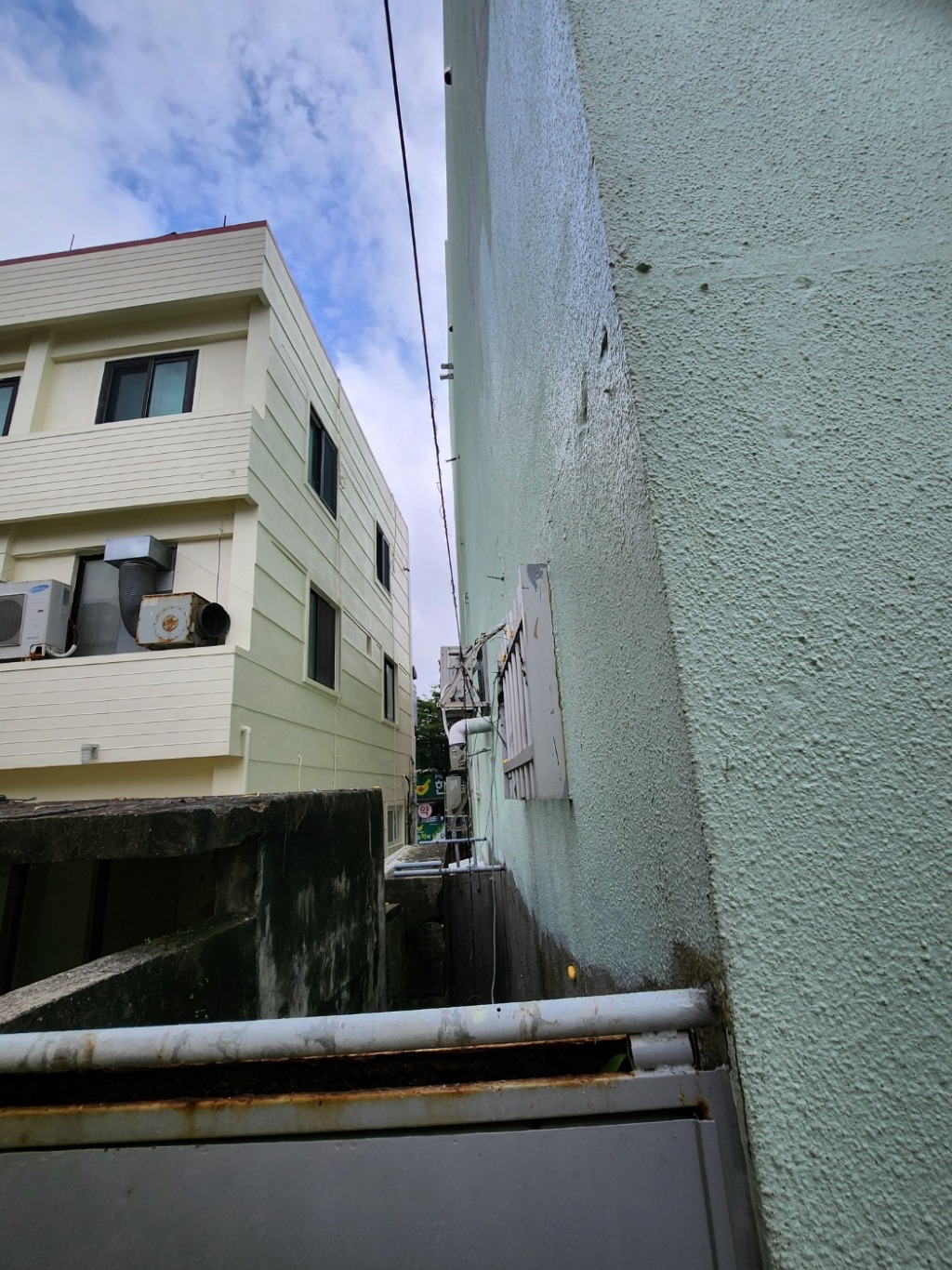 사진의 건축물을 가지고 있는데, 타일이 붙여져 있지 않은 쪽에 누수가 발생하곤 합니다. 2년 전에 메쉬를 치고 방수페인트를 하였는데, 올 해 동쪽에서 바람이 불면서 시간당 많은 비 내릴 때 그 때 동쪽 벽면에 누수가 생겼습니다.