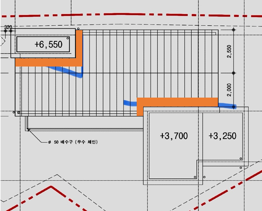 이 부분은 해결이 무척 어려운 부분입니다. 그러므로 이런 모양으로 설계를 할 정도면, 건축사가 디테일에 대한 자신이 있는 분이실 것이므로, 우선은 담당 건축사에게 해결 방법을 제시해 달라고 이야기를 하는 것이 좋습니다.