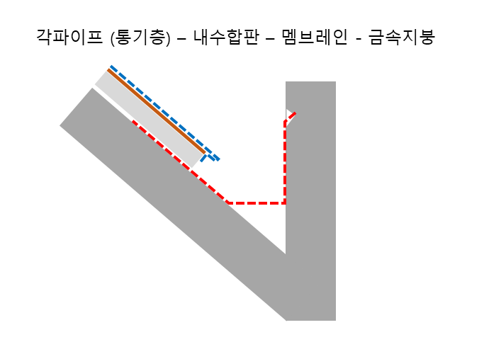 실제로 이런 삼각형 추가 지붕이 어렵다고 한다면.. 경사지붕과 벽이 만나는 둘레를 따라서 금속 골을 만들어 주어야 합니다.