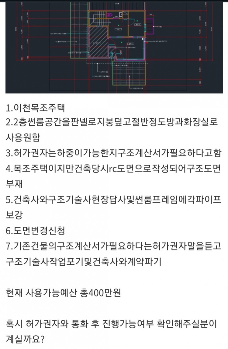 혹시 상기 예산안에서 가능하신 건축사님계시면 컨택부탁드립니다. 더 이상 금전적 손해를 보지않도록 책임지고 처리가능하신분을 뵙고 싶습니다.
