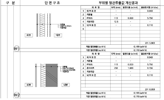 저도 궁금합니다. 이 사진중 왼쪽 실제는 건설사가 이렇게 시공했다고 말하고 있고, 실제 저희집이 이렇게 시공되어있습니다. 도면상에는 오른쪽처럼 되어있어야한다고 생각되는데요. 이유는 115T 단열재를 붙이라고 되어있고 시방서상에 단열재끼리 붙여서 기밀시공하라고 되어있습니다. 이 사진중 오른쪽 도면을 기준으로 열관류율을 계산했는데. 왼쪽 실제 처럼 시공했다면 열관류율을 만족하게 되는것인지요?  그리고 아래 사진은 부위별성능관계내역입니다. 저렇게 게산이 되어있습니다.