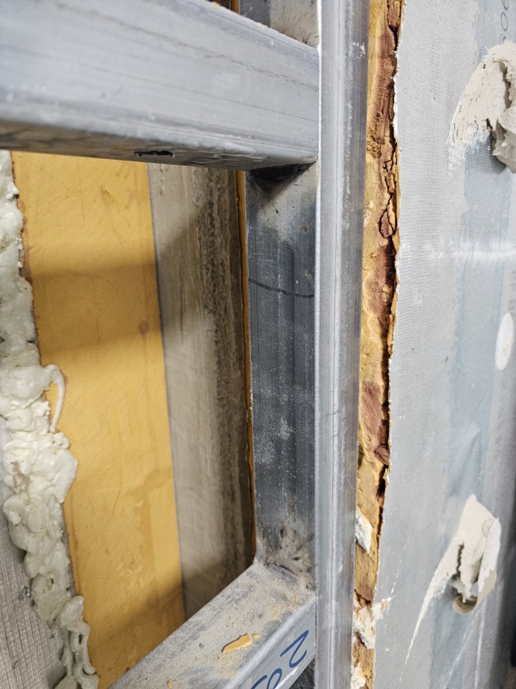 최상층세대에서 결로등의 문제로 테리스바닥에서 외벽을 뜯어보니 시공 된 1)외단열재 두께가 도면상 115T에서 80T로 시공되었고 2)PF보드 은박면이 손상되어 준불연기능 상실 3)외장판에 직접 추가로 단열재를 붙여 단열재가 조각조각나 단열재로써 기능상실 4)창호테두리 단열재 결손을 확인하였습니다.