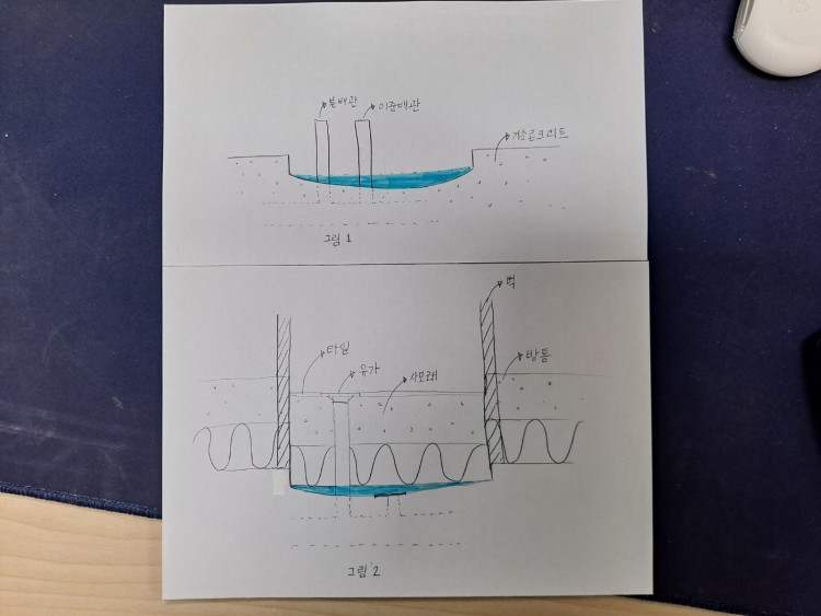 이중배관을 위해 샤워실에 50mm 배관 2개를 그림1과 같이 본배관과 이중배관 설치했습니다. 콘크리트 양생 후 파란색과 같이 이중 배관쪽으로 구배를 주었습니다.
