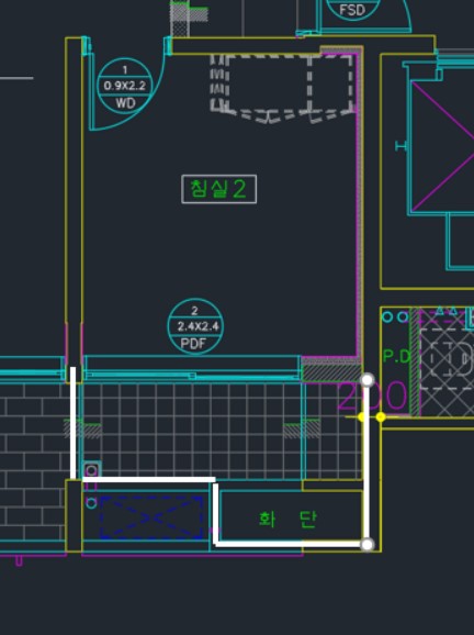 외기와 만나는 벽은 100T로 시공 예정이며, 흰색 원 아래 부분의 창문과 연결된 벽도