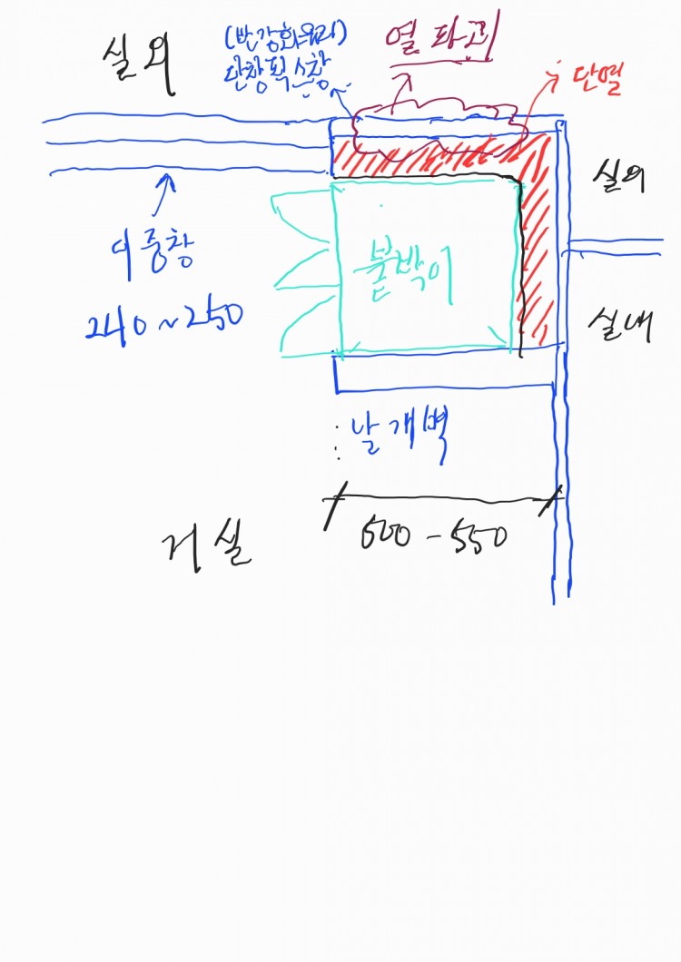 (아래 그림상) 좌측부터 날개벽 끝선까지를 이중창.