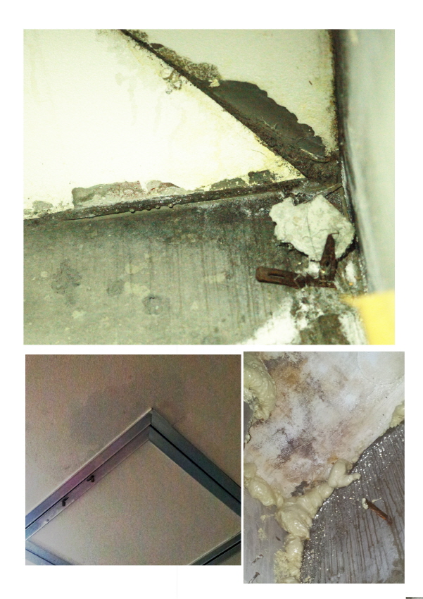 2008년 여름 이후 천장에서 누수가 자주 발생하여 여러 차례 하자 보수를 하였습니다. 그러던 중 마지막 하자 보수 후 천장에 점검구를 달아 원인을 파악한 결과 옥상내부에 단열재가 되어있지 않아 결로가 지속적으로 발생하여 문제가 생겼다는 것을 알게 되었습니다.