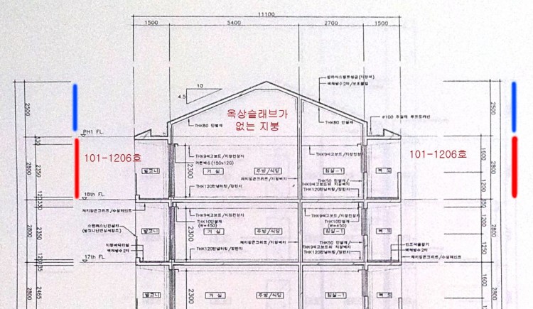 첨부된 도면에서 같이 당 아파트는 박공지붕과 최상층 세대 천장 사이에 슬리브가 되어있지 않습니다.