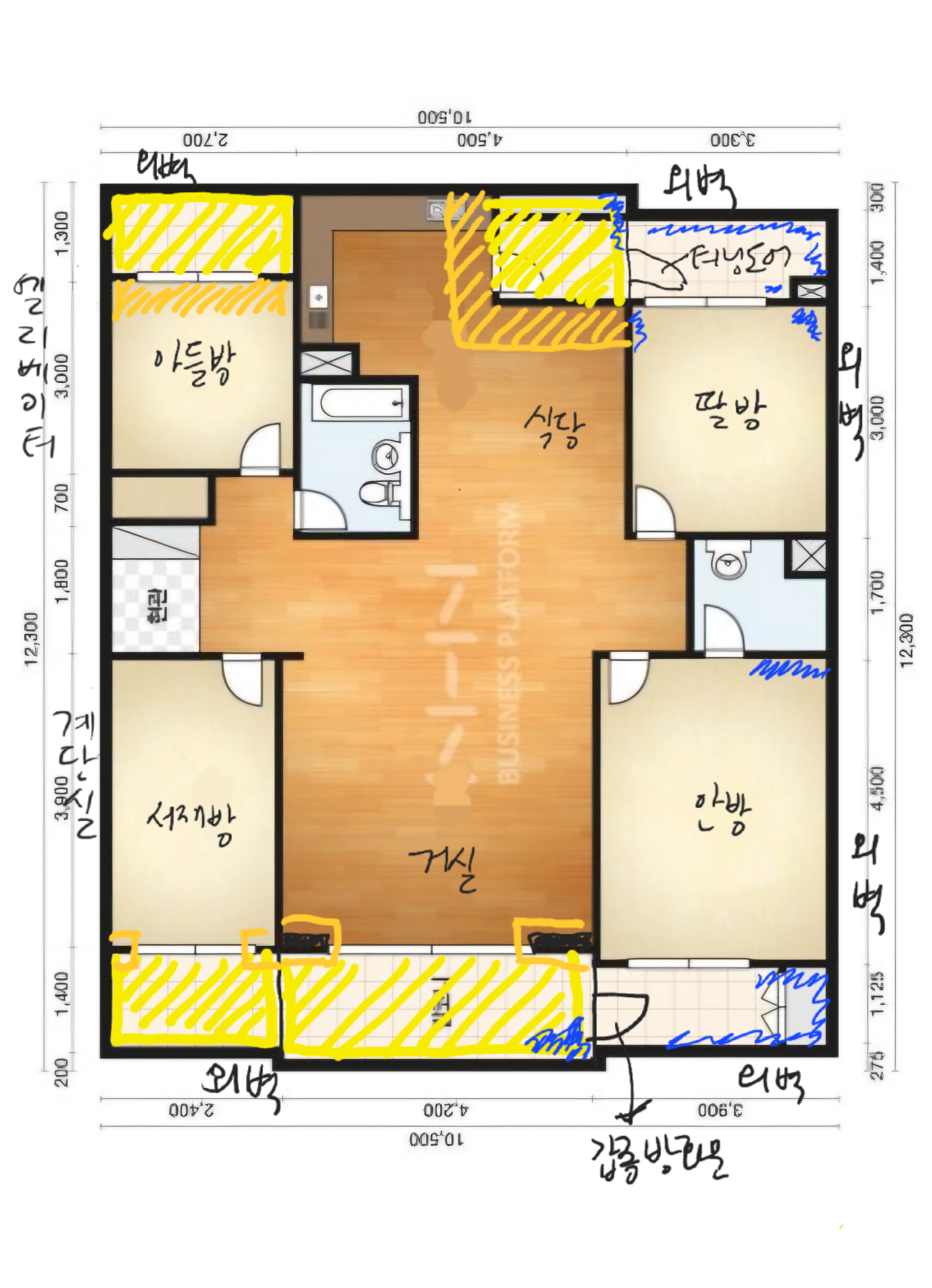 윗댓글 그림 설명: 노란 빗금이 확장부로, 제가 생각할 때 단열재100t 단열이 필요한 곳이고 주황은 날개벽 및 확장부에 면한 부분으로 단열재30t로 안될까.. 하는 부분입니다. 파랑은 곰팡이가 확인된 부분입니다.