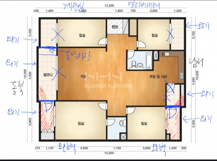 안방은 창에서 가장 먼 벽(방 안에 있는 화장실 문 옆 벽 하단)에서 많은 곰팡이가 확인되었습니다(파란색 표시가 현재까지 확인된 곰팡이 부위입니다).