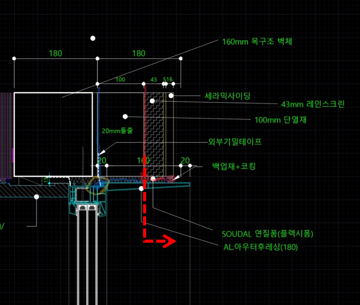 2. 외단열표면을 타고 흘러내려온 물(빨간색)은 밑에서 우레탄폼 시공한 면과 만나고 이 물이 자연스럽게 배수되기 어려울 것 같은데