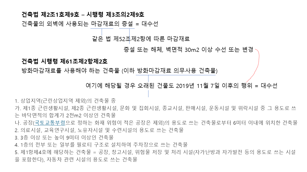 즉, 대수선은 [건축법 제52조2항에 따른 방화에 지장이 없는 재료로 해야 하는 외벽을 증설 또는 해체한 경우]에 해당 하는데....