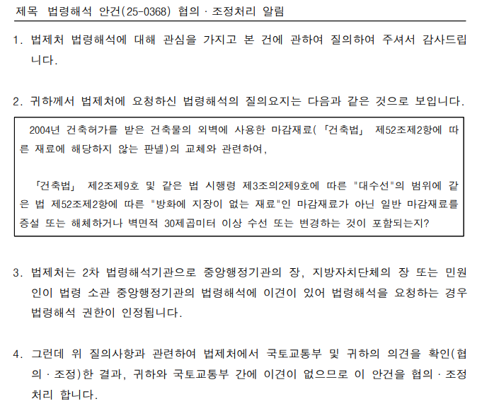 (국토교통부 법령해석이 법제처 공문으로 나온 내용임)
