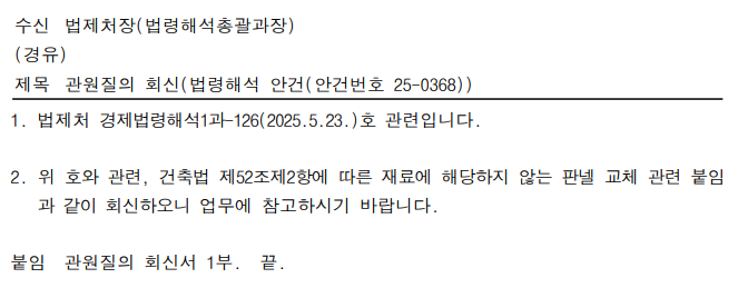 이 법제처 해석대로라면 2004년 허가받은 창고시설의 샌드위치판넬 교체도 대수선 허가건으로 판단하여야하는지 궁금합니다....