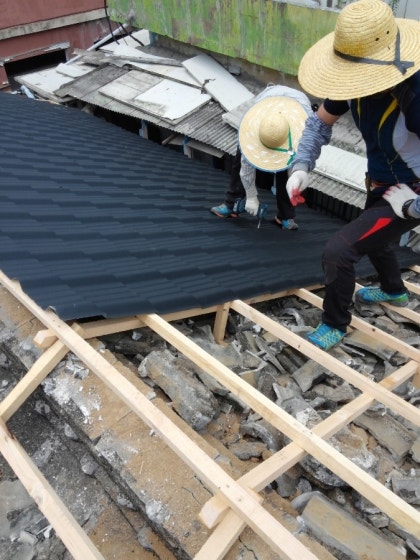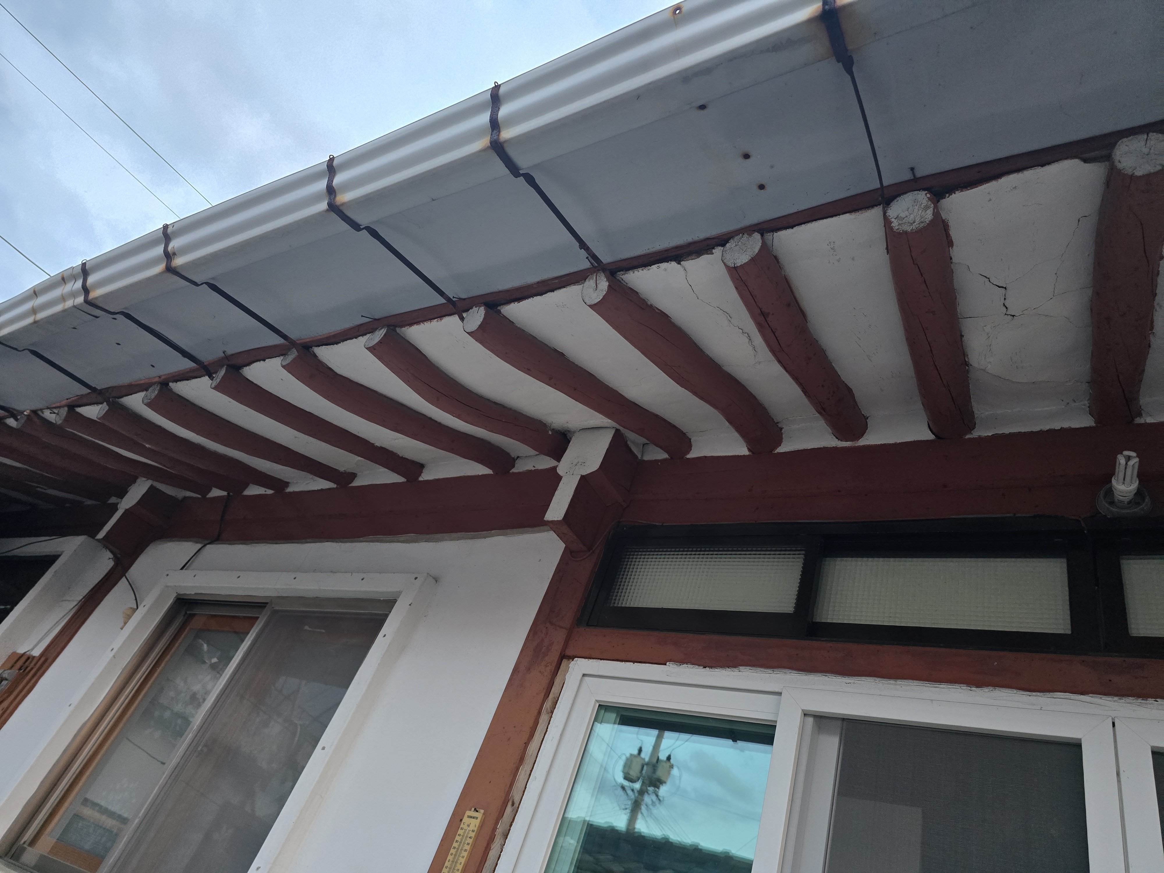 1. 지붕: 기존 기와 지붕은 주방 쪽만 약간 새고 있어 철거하지 않고, 그 위를 박공 칼라 강판 기와로 덮습니다