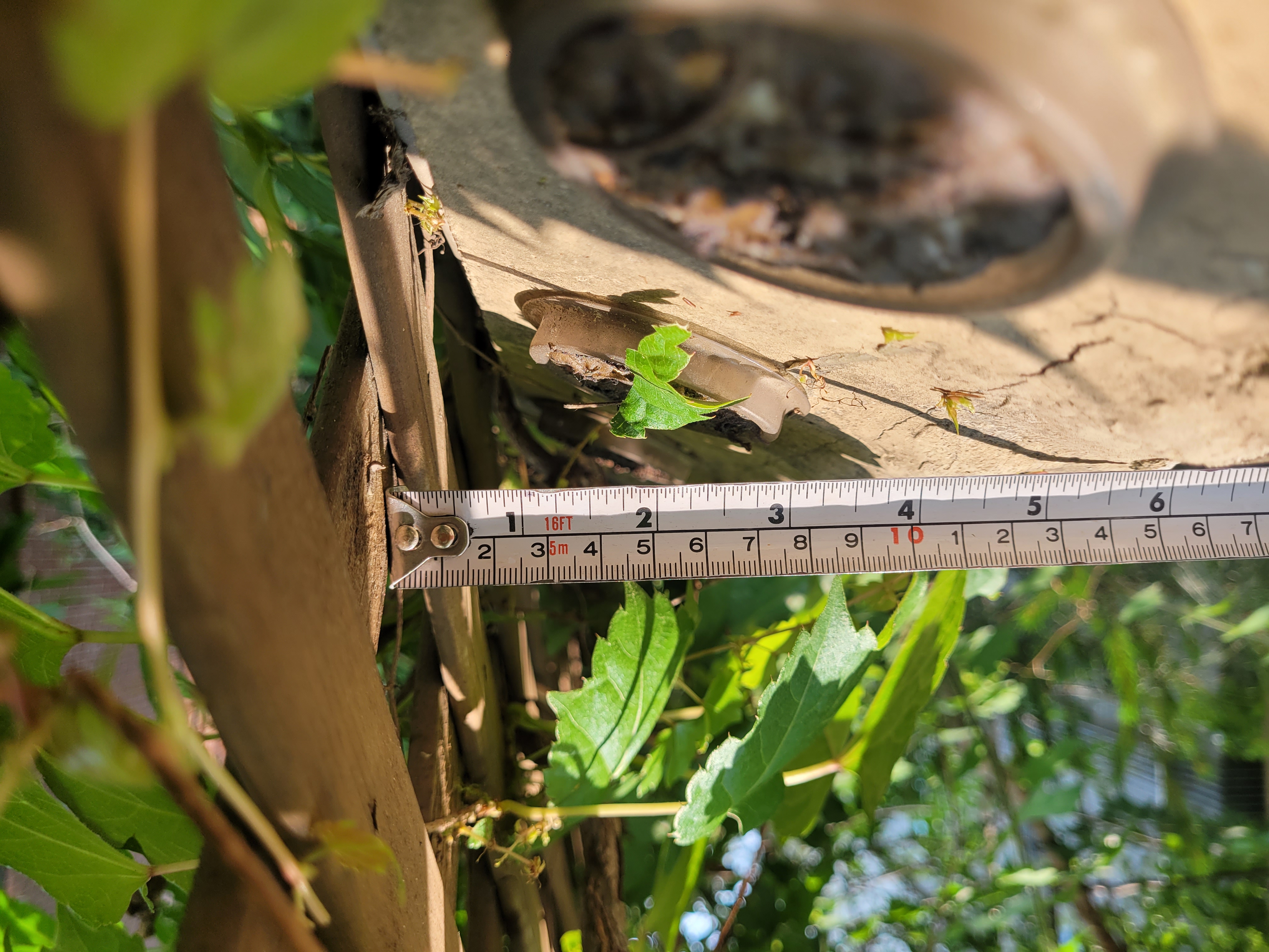 격자 울타리 상부 면에 붙일 수 있는 폭은 15센티 입니다. 특이하게 면이 바깥쪽으로 경사져 있고, 바깥 쪽 끝에 격자 울타리가 붙어 있습니다. (왜 이렇게 시공 했는지는 모르겠습니다. 건너편으로 넘어 갈 수도 없어서 격자 울타리가 어떻게 붙어 있는지도 볼 수 없습니다) 담장의 총 길이는 약 13미터 입니다.