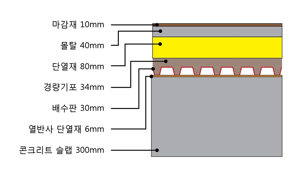 300mm콘크리트 슬라브 - 시트방수 - 100mm 압출법 단열재 2겹 - 우레탄 샌드위치 판넬 100mm - 합판 - 방수시트 - 벤틸레이션 매트 - 징크마감