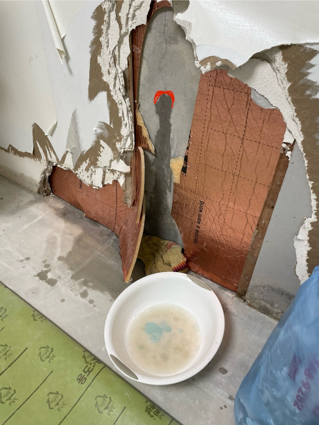 지금의 누수 위치에서 볼 때 가스배관의 앵커가 박혀 있는 위치와 거의 유사한데, 표면 단열재 뒤로 넘어간 물이 해당 위치로 나오는 것이기에, 외부에서 앵커 주변에 무언가를 바르는 것은 해결방법이 되지 못합니다.