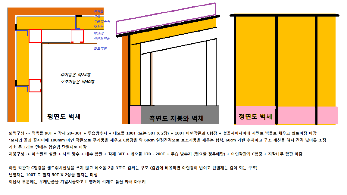 외벽에서 내벽쪽으로 -> 적벽돌 9센티 + 공기층 3센티 + 방습지 + ESB 합판 + 형강 사이사이에 네오플 (또는 비드) 10센티 + 황토벽돌 9센티 로 마무리를 할까 합니다.