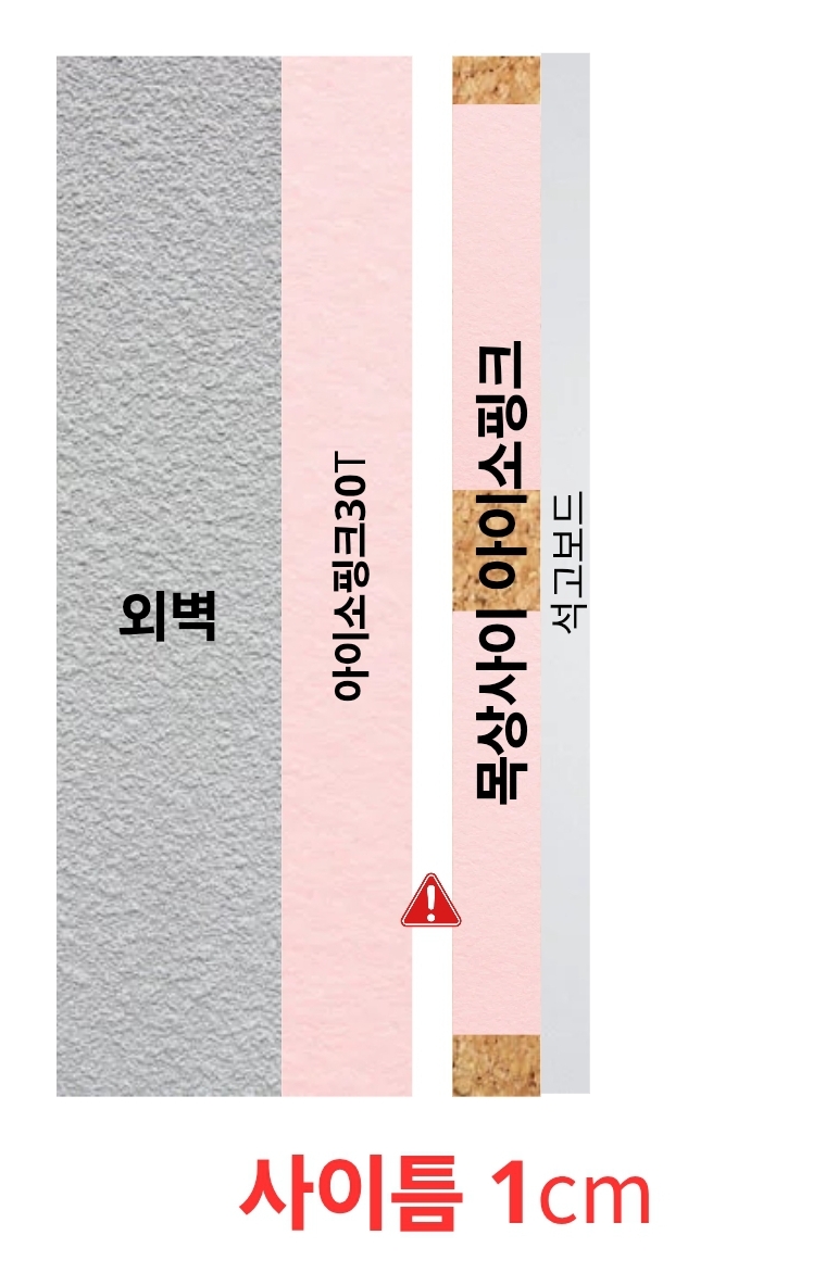외벽>아이소핑크>1cm틈>목상틈에끼운아이소핑크>합판>석고