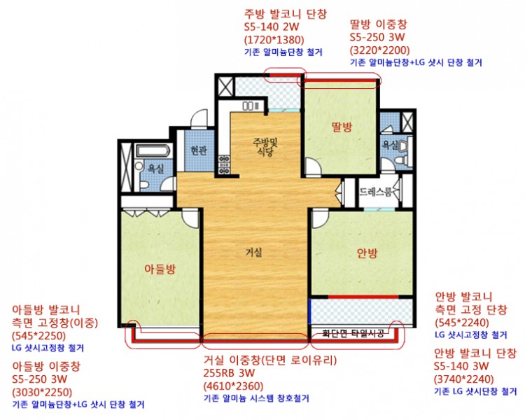 거실 창호사양은 3W 인테리어발코니 이중창(D255B) 2면을 로이유리시공, 딸방 사양은 3W 슈퍼세이브5 이중창(S5-290) 1면 로이유리 시공의 사양으로 계획하여 월요일에 계약을 하고 발주를 할 예정입니다.