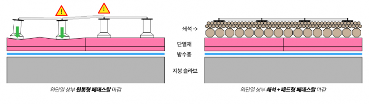 이 사진에 따르면 일반 원통형 페데스탈을 사용한 후 집중하중 시 들떠있던 단열재가 눌리며 바닥이 움직이게 된다고 하는데 쇄석을 통해 들떠있는 단열재를 눌러준다면 전혀 문제가 없는 건가요?