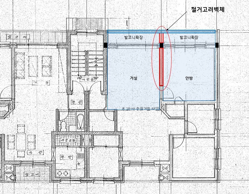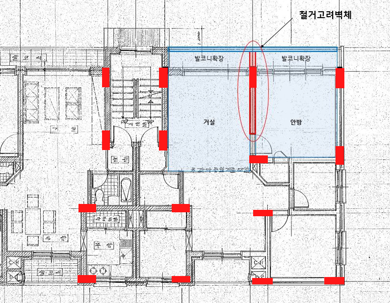 해당 건물은 주요 구조부가 철근콘크리트 구조로 건축도면상 하기의 빨강색 표시벽체를 비내력벽으로 보고 철거 및 확장 계획을 가지고 있습니다.