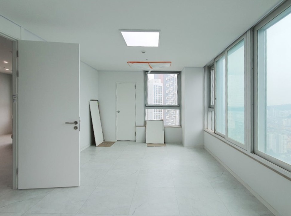 오피스텔이 커튼월 비스무리한 구조인데다가(진짜 커튼월인지는 잘 모르겠네요. 석재 마감이 같이 있어서...) 지상철이 인근에 있는 관계로 당연히 대부분 세대에서 덧창이라고, 커튼월 뒷편에 창을 하나 더 단 시공을 했더군요.