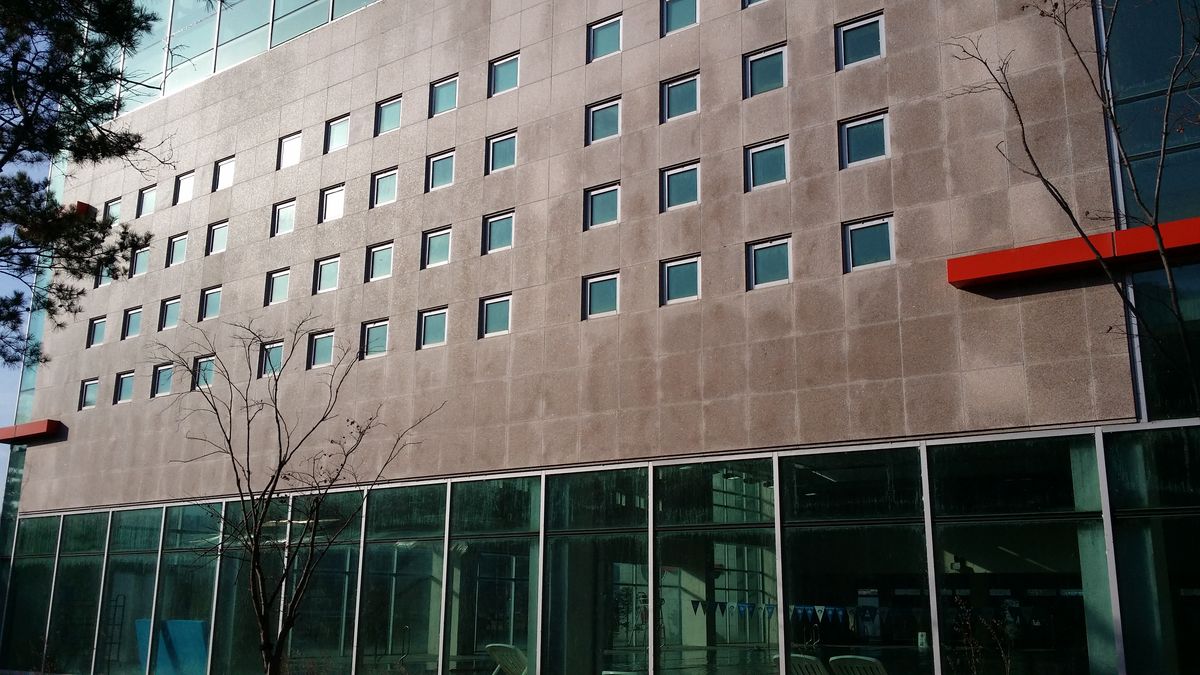 첫번째 건물 전면 사진을 보면, 외부 마감을 한 화강석의 색깔이 고르지 않음을 확인할 수 있습니다. 결로 현상 혹은 단열 미흡의 원인으로 해당 현상이 나타날 수 있는 여지가 있을까요? 아니면 단순 오염(빗물이나 기타 원인으로)일까요?
