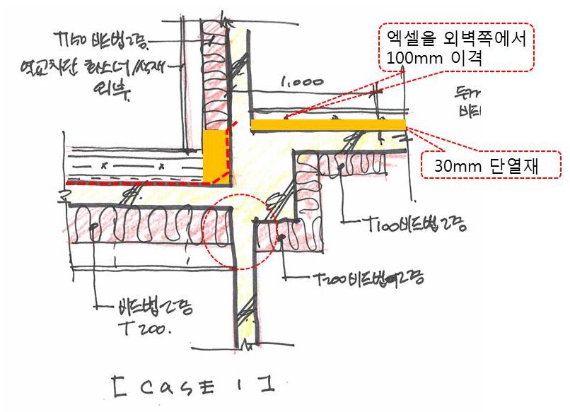 CASE 3> 2층 테라스하부 - 단열200이 들어가면 콘크리트 단차이가 너무커져 내단열로 들어가야할듯합니다. 파라펫때문에 단열이 끊어지는것도 걸리구요.