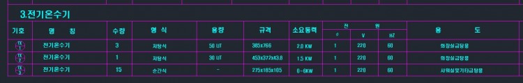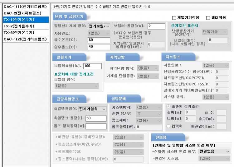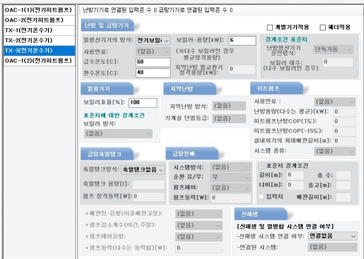 일람표를 보고 난방기기에 입력한 것인데 소요동력과 보일러 용량은 다른 개념인듯하지만 전기온수기이다보니 일람표에 따로 보일러 용량은 없어서 소요동력을 보일러 용량에 입력하고 급탕축열탱크 펌프 정격동력은 비워두었습니다.