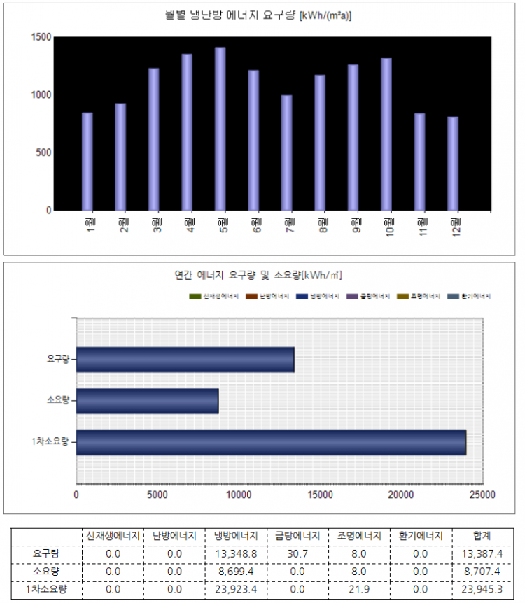 냉방 요구량이 막대한 것으로 보아서.. 벽체 열관류율이 제대로 입력된 것인지 보세요.