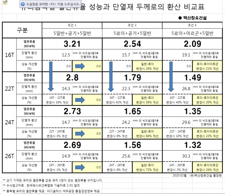 유리 품목별 단열성능과 품목이 변경될때 성능 개선율, 그리고 해당 유리 1장을 단열재로 환산했을때 단열재의 두께를 표로 정리해 봤습니다.