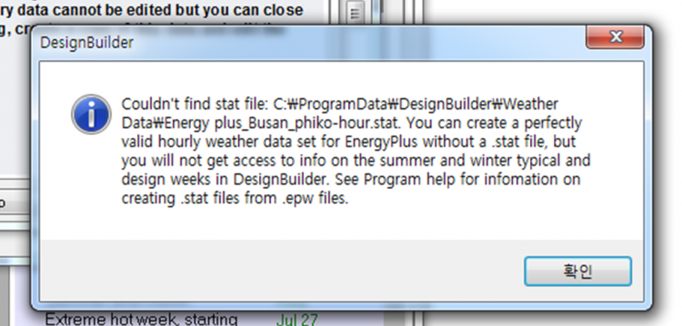 에러메세지에 나와 있듯이.. 디자인빌더 도움말을 보시면, epw 파일을 stat 파일로 변환할 수 있는 방법이 나와 있습니다.