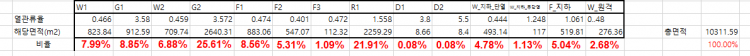 아래의 첨부된 엑셀화면은 제가 각 입력한 열관류율 별로 해당 면적이 얼마나 되는지를 나타낸 표 입니다.