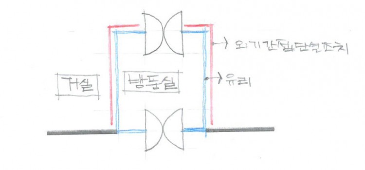 첫번째 좌우 전면유리부분에 대해 단열조치를 하지 안는다면 방풍실을 비냉방공간으로 보아 거실에 접하는 유리벽은 모두 첨부파일처럼 외기간접단열조치를 해야하는지요?