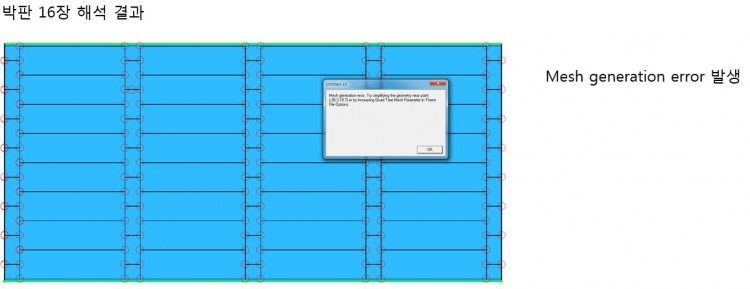 이러한 error에 대하여 찾아보면 첨부3과 같은 해결방법을 제시하였습니다. 지나치게 세부적인 모델링의 경우 발생하는 것으로 보이는데, 첨부1의 박판 12장에서 첨부2의 박판 16장으로 단순히 박판수 4장을 추가함에 따라 이러한 error가 발생하는 것이 이해가 되지 않습니다.(해결방안의 Quad Tree Mesh Parameter 수를 증가하여 보았으나 같은 error가 발생함 ) 현 상황의 문제를 해결할 수 있는 방안을 알려 주실 수 있으신지요?