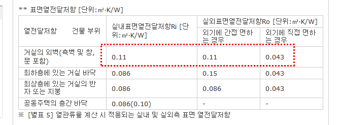 값이 다른 것은 각 나라마다의 실험기준이나, 결과값의 해석차이에서 발생합니다. 즉, 실내외표면열전달저항 값이 나라마다 조금씩 다릅니다.