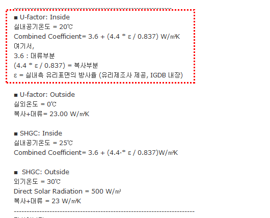 ε = 실내측 유리표면의 방사율 (유리제조사 제공, IGDB 내장) 입니다.