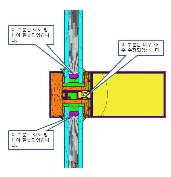 안녕하세요.. 오류 부분은 크게 세군데 입니다. 너무 많이 수정이 된 부분은 노드점이 작은 영역에 너무 많이 몰려있어 그렇습니다. 처음부터 새로 그리셔야 합니다. 작도가 잘못된 부분은 환형의 입력방법이 잘못된 것입니다. 도넛 형태의 입력 방법은 자료실의 한글 메뉴얼에 나와 있습니다. 그 외에도 수직/수평이 맞지 않는 부분이 다수 있으며, 시뮬레이션은 되지만 결과값의 신뢰도를 많이 떨어뜨리는 부분도 존재합니다. (예를 들어 재료와 재료사이가 제대로 붙지 않았으나, 페인트통으로 부어 넣으면서 너무 좁은 틈이 존재하는 경우) 자료실의 메뉴얼과 이 게시판의 다른 분이 올리신 입력파일을 충분히 숙지하신 다음에 입력을 하시는 것이 좋을 듯 보입니다. 감사합니다.
