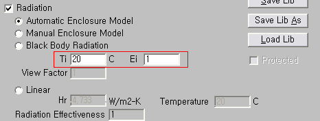 안녕하세요.. Radiation 의 설정에서 Ti 는 실내측 온도이고, Ei 는 실내측 방사율입니다. 온도는 의도대로 설정하시면 되고, 방사율은 특별한 사유가 없는 한 1.0을 기본으로 합니다. 감사합니다.