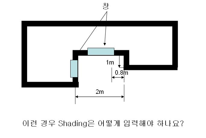 제가 이해가 편하시도록 다시 보완해서 그려보았습니다. 그림의 윗쪽을 북측으로 가정하고 남측을 향한 창을 W1, 동측을 향한 창을 W2라고 하겠습니다. ■ W1의 경우 1. oReveal (Window Reveal Depth) : {(2m+0.1m)+(1m+0.1m)}/2 = 1.6m 2. dReveal (Distance from Glazing Edge to Reveal) : {(0.9m+0.13)+(0.9m+0.13m)}/2 = 1.03m Overhang의 창호단면이 평면상의 Reveal과 같다고 본다면 3. oOver (Overhang Depth) : 0.1m 4. dOver (Distance from Upper Glazing Edge to Overhang) : 0.13m ■ W2의 경우 1. oReveal (Window Reveal Depth) : {(3m+0.1m)+0.1m}/2 = 1.6m 2. dReveal (Distance from Glazing Edge to Reveal) : {(0.3m+0.13m)+0.13m}/2 = 0.18m Overhang의 창호단면이 평면상의 Reveal과 같다고 본다면 3. oOver (Overhang Depth) : 0.1m 4. dOver (Distance from Upper Glazing Edge to Overhang) : 0.13m 유리의 하부가장자리로부터 반대편 벽체의 상단 높이를 3m로 가정한다면, 5. hHori (Height of the Shading Object) : 3m 6. dHori (Horizontal Distance) : 0.1m+3m = 3.1m 7. rOther (Additional Shading Reduction Factor) - W2의 반대편에 있는 벽체가 창폭의 7/12(약58%)만큼 가려져 있으므로 : 100%-58% = 42% 위와 같이 입력해 주시면 됩니다. 너무 어려운 문제를 내어주셔서 설명하는데도 한참 걸리네요.. 보통 위와같이 애매한 경우는 Ecotect 같은 그림자를 시뮬레이션 하는 프로그램으로 그림자의 영향을 분석하여 입력하는 것이 더 좋습니다. 감사합니다.