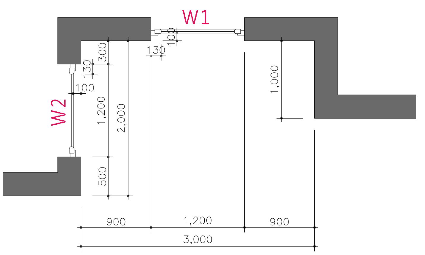 그림의 윗쪽을 북측으로 가정하고 남측을 향한 창을 W1, 동측을 향한 창을 W2라고 하겠습니다.