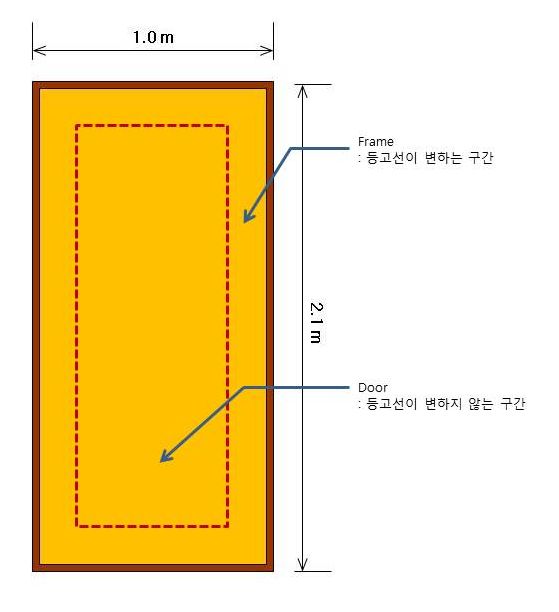 -> 이 것은 도어와 프레임이 두개의 파일로 따로 모델링을 하셔야 합니다. 즉, 지금 그리신 그림은 모두 프레임입니다. 아래 그림을 보시면 이해가 가실 터인데요.. Door 부분은 등고선이 변하지 않는 일정한 구간만 해당합니다.
