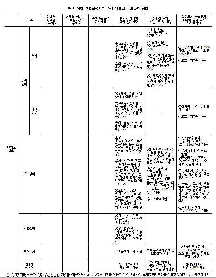 이 중에서 에너지의 판단은 이른바 "에너지성능지표(EPI)"점수와  신재생에너지설치용량에 의존하는데, EPI 안에 건축(패시브), 기계/전기(액티브)로 나뉘어 집니다.