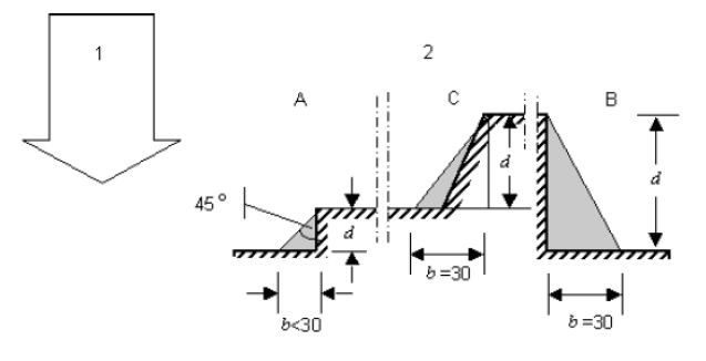 프레임에서 열류의 방향과 직각인 면으로 부터 45도인 사선을 그렸을 때, 사전 끝 점까지의 거리가 30mm를 넘으면 30mm까지, 넘지 않으면 45도 선분의 끝점까지 위에서 만든 B/C 중에서