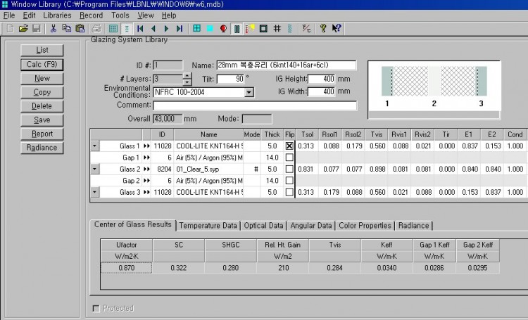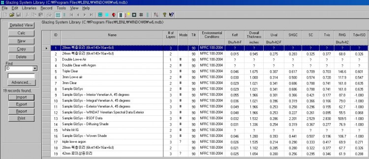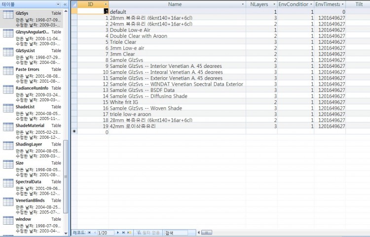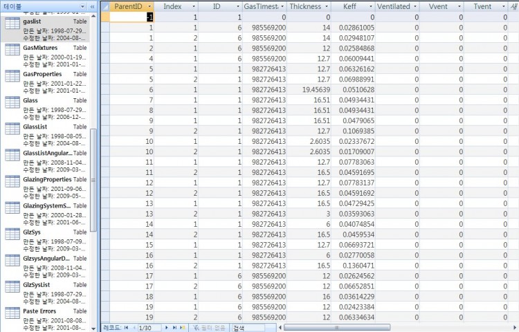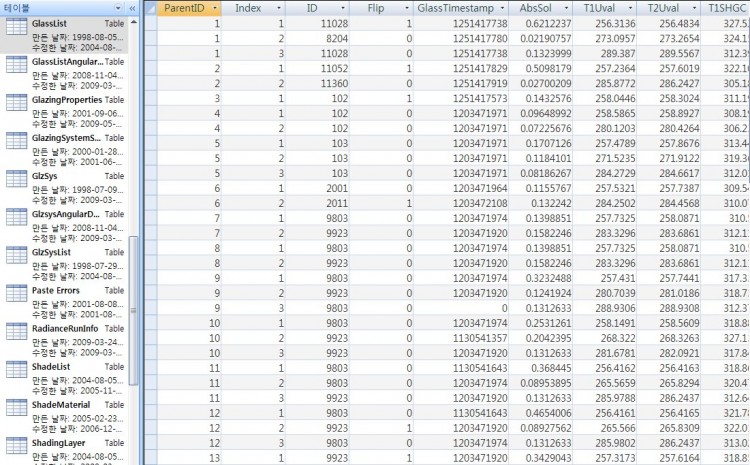 c:/Program Files/LBNL/WINDOW6/ 에 보면 "w6.mdb"라는 파일이 있습니다. 이 파일은 Access에서 오픈이 가능합니다. 이 것을 오픈하면 왼쪽에 DB의 구조가 보이는데.. 아래와 같이 3가지 제목을 클릭해 보시면 만들어 놓은 글래징리스트를 보실 수 있습니다.